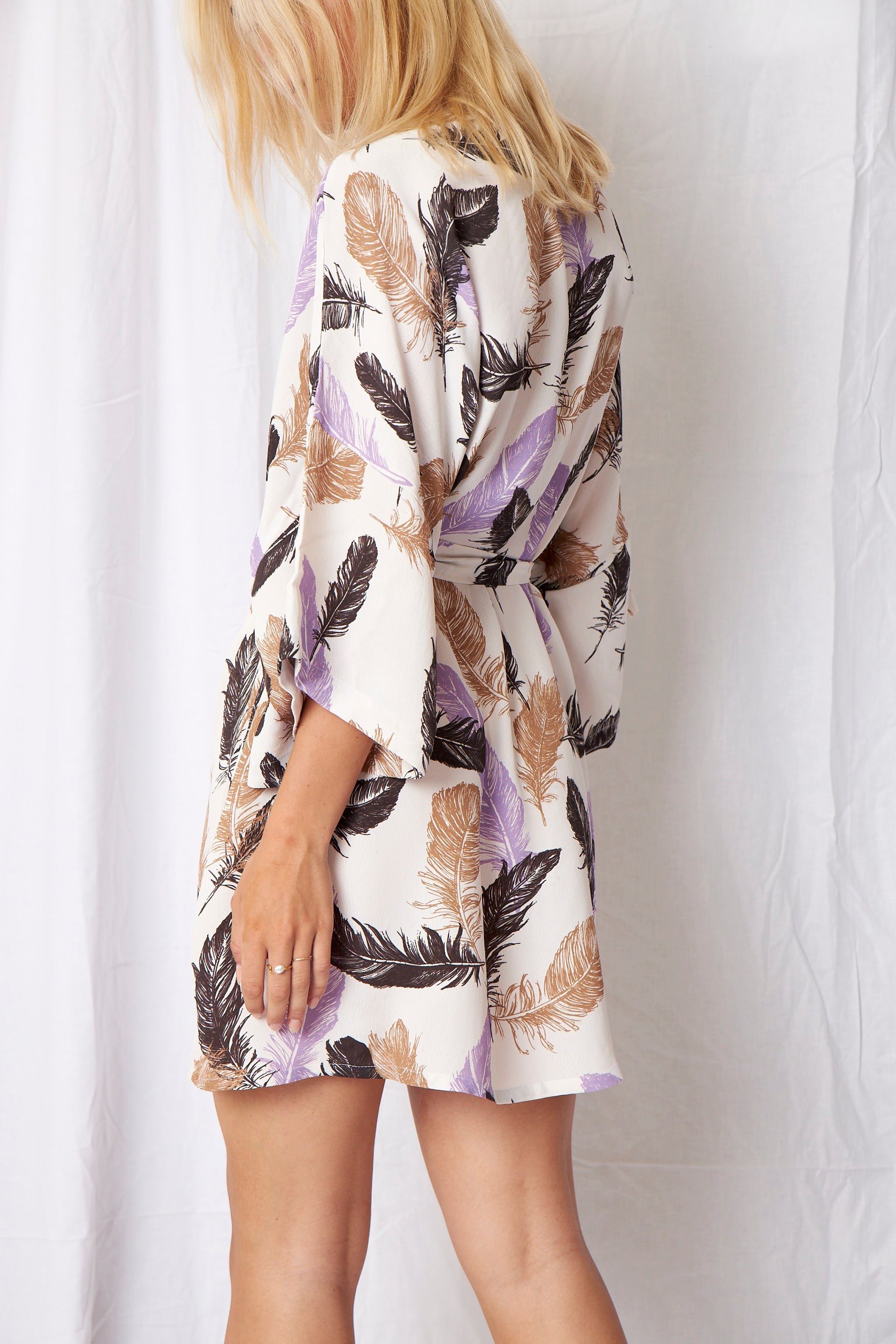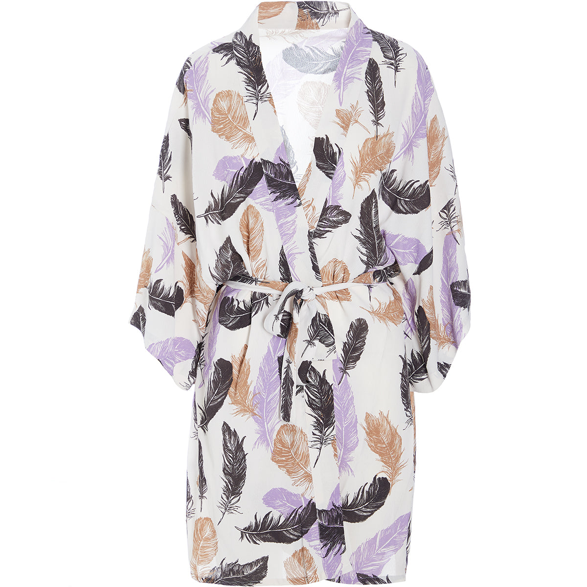 Kimono med løst bælte i en let kreppet viskose kvalitet med fjer print.