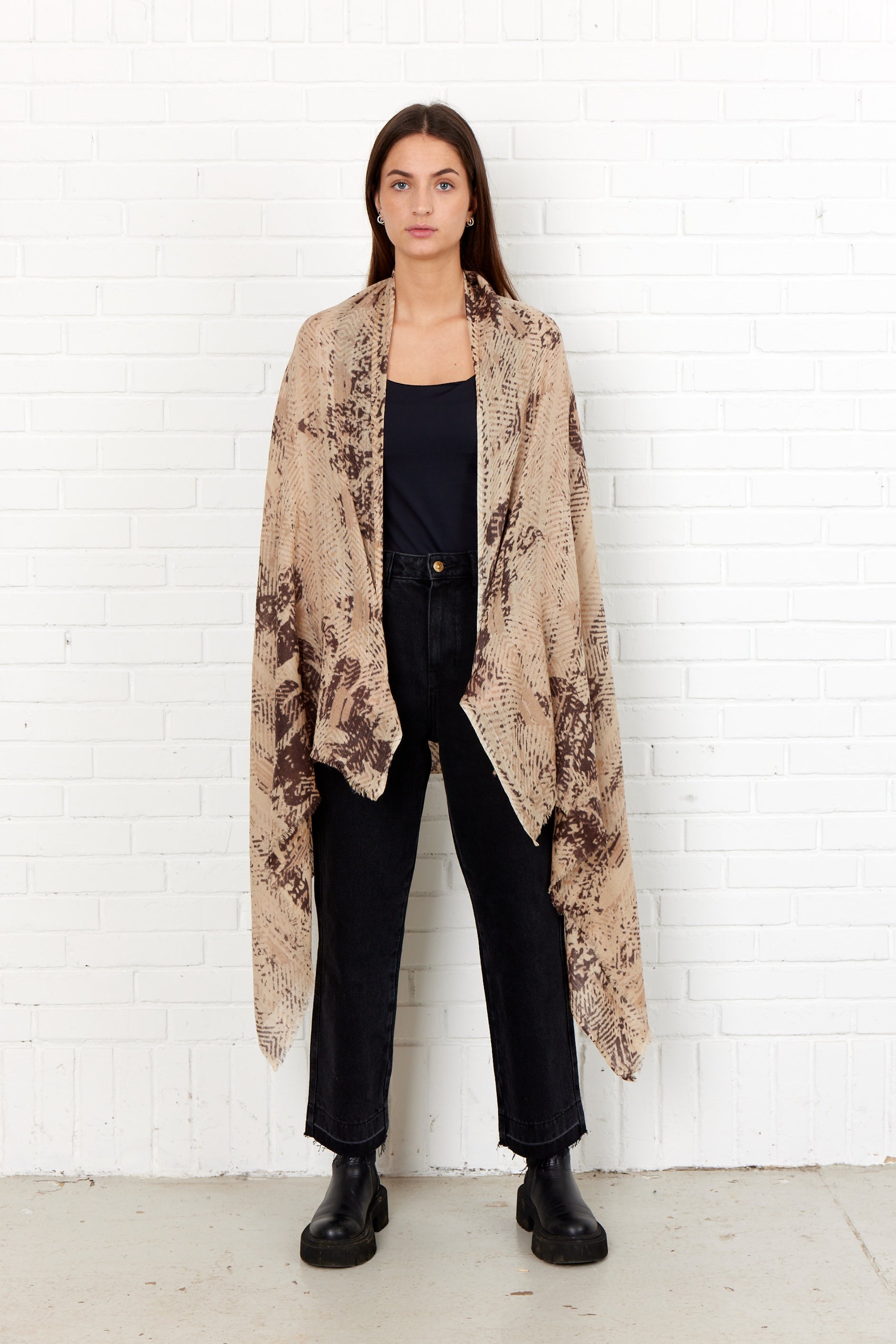 Aflangt tørklæde i en blød ren uld med oversized "antik look" brokade print og rå ender..