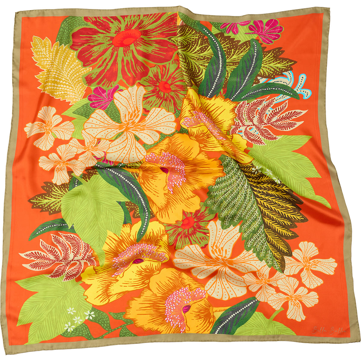 Square Scarf in 100% silk Twill with a print of a large bouquet of flowers on an Orange base.