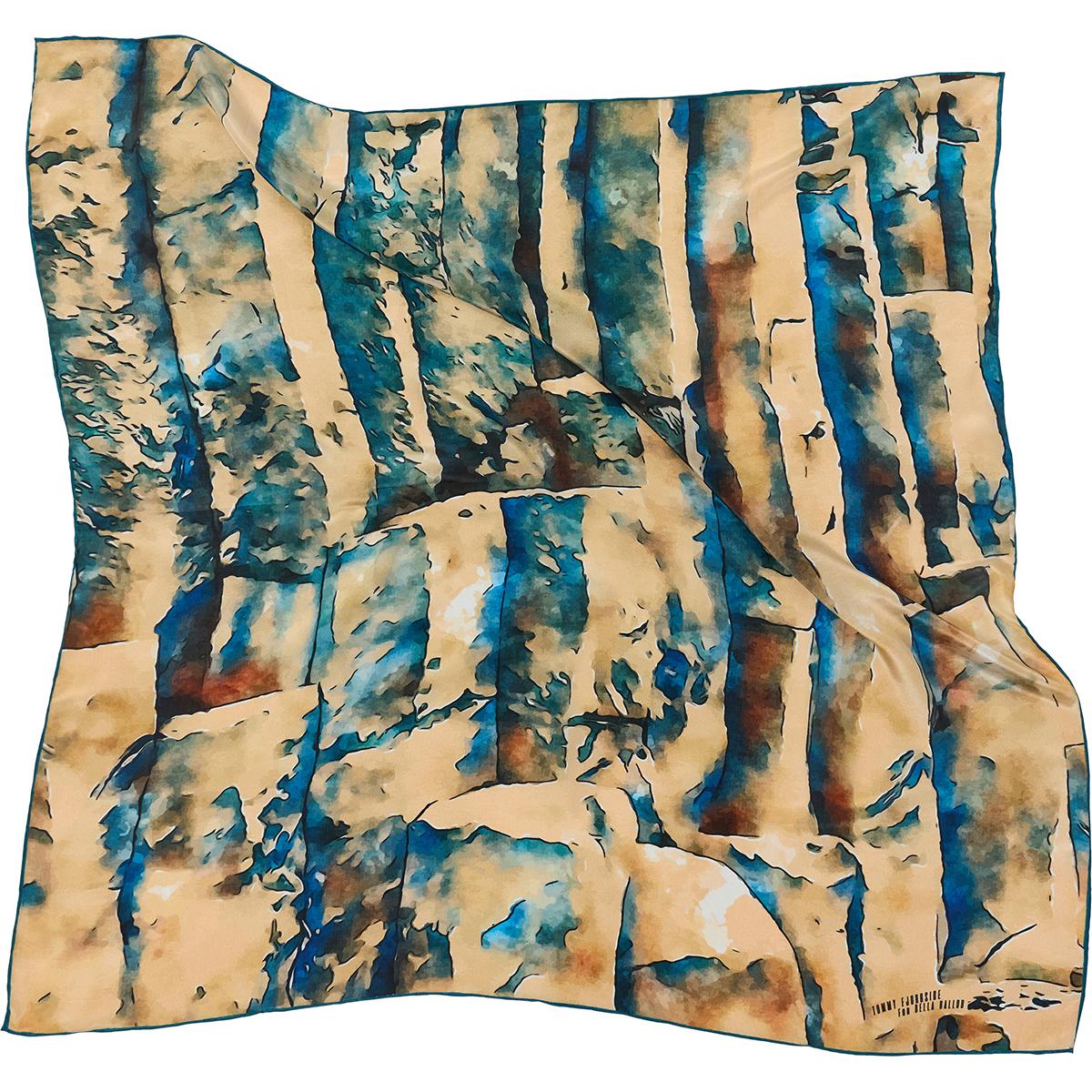 Square Scarf in 100% silk Crepe de Chine with a print of abstract bamboo canes in calm bluish tones.