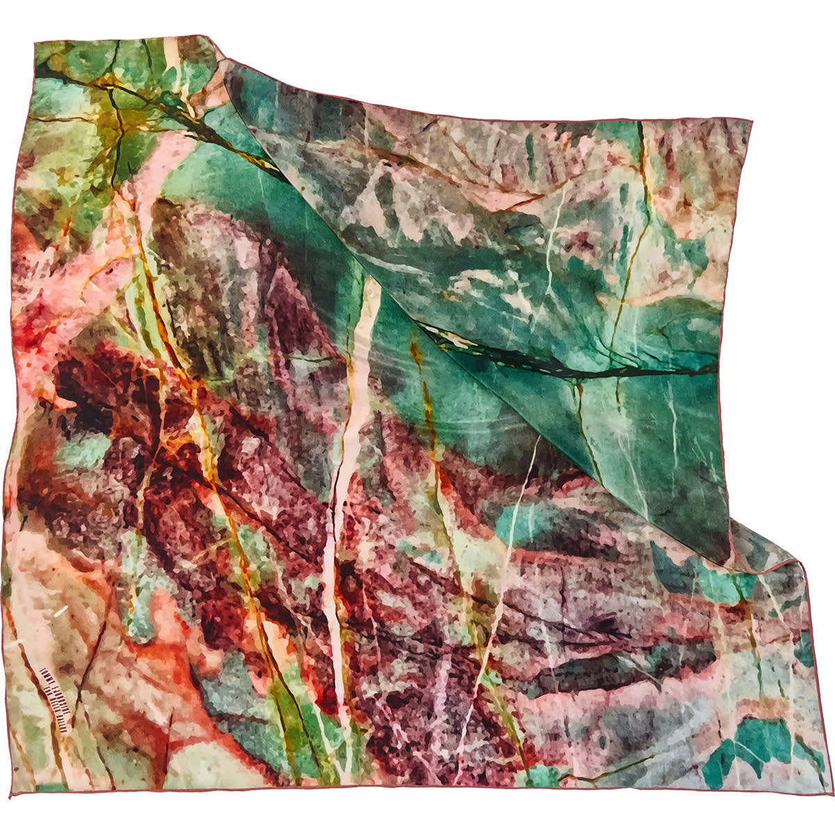 Square Scarf in 100% silk Silk Crepe de Chine with an abstract print of granite in green/pink colors.