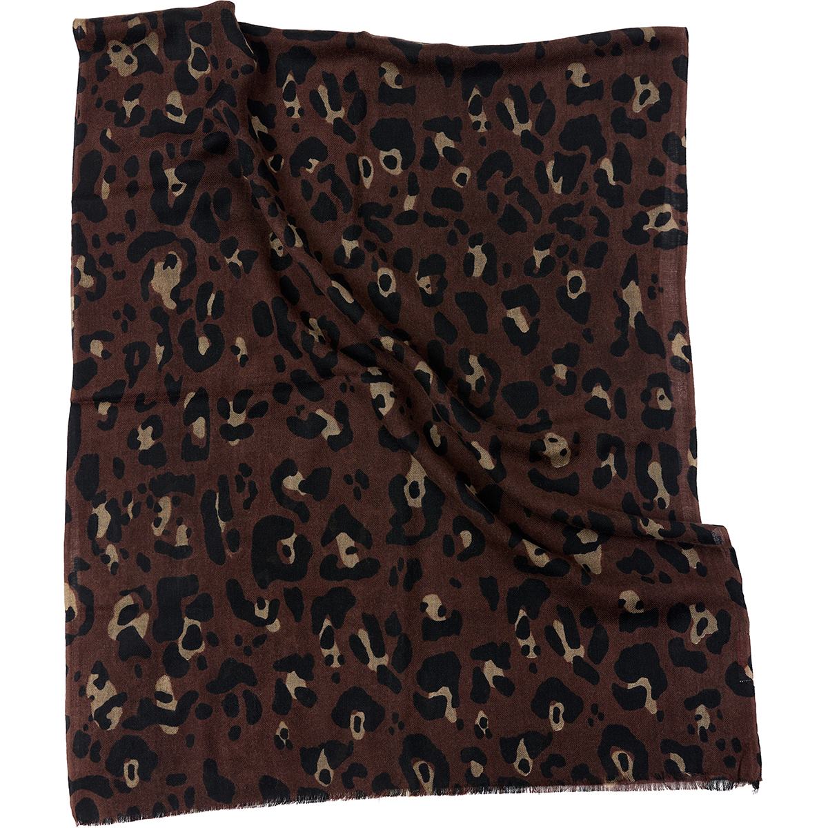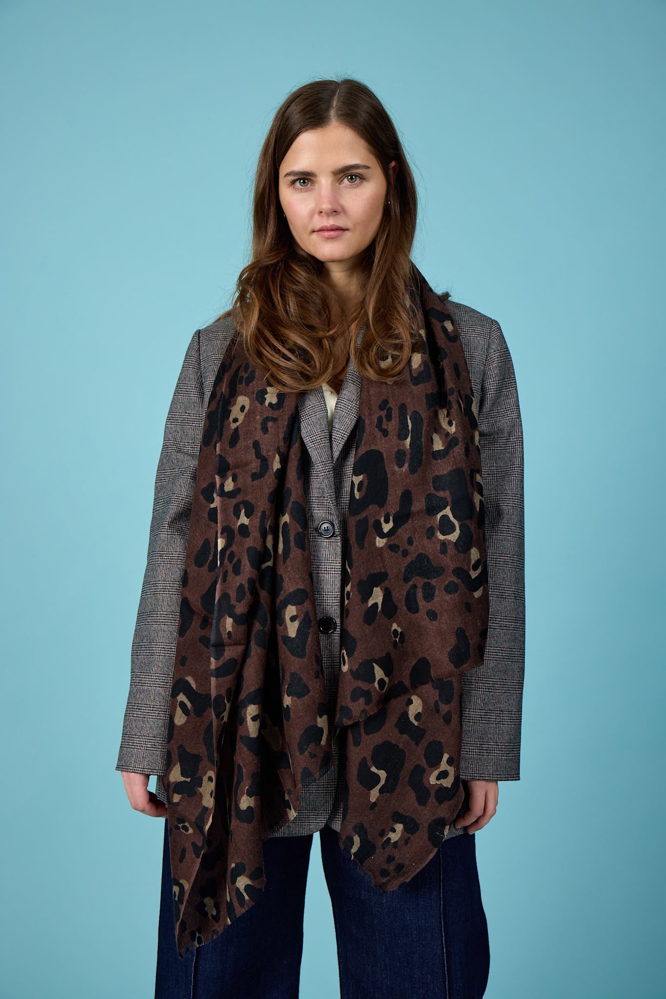 Rectangular Scarf in a soft pure Wool with leopard print and raw ends.