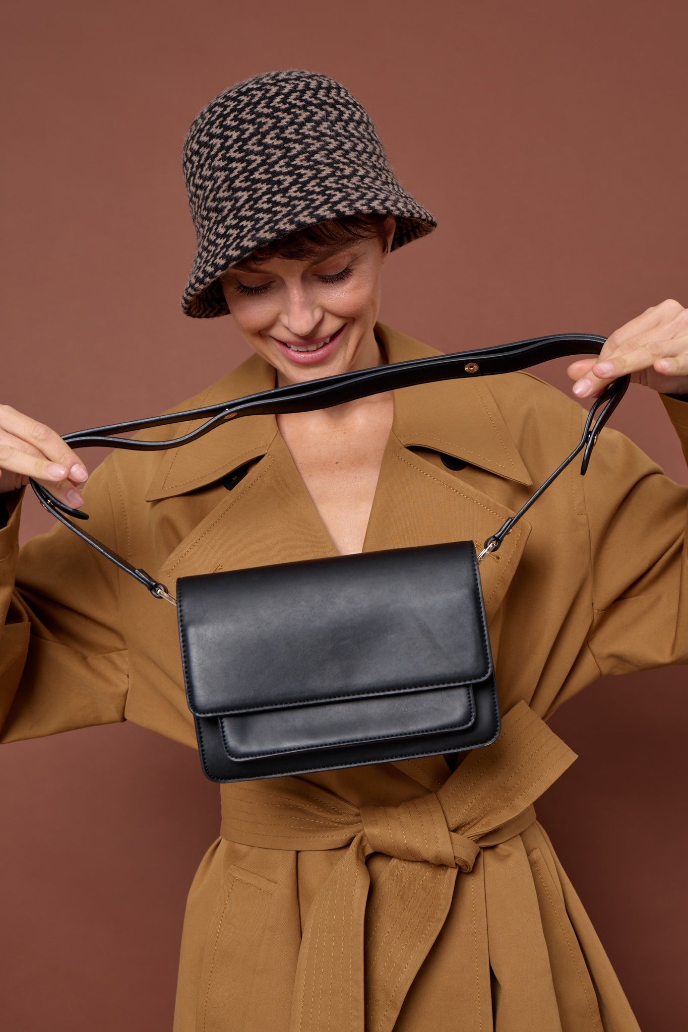 Crossbody bag in PU with 3 inner compartments and 1 outer compartment. Adjustable shoulder strap and magnetic lock.