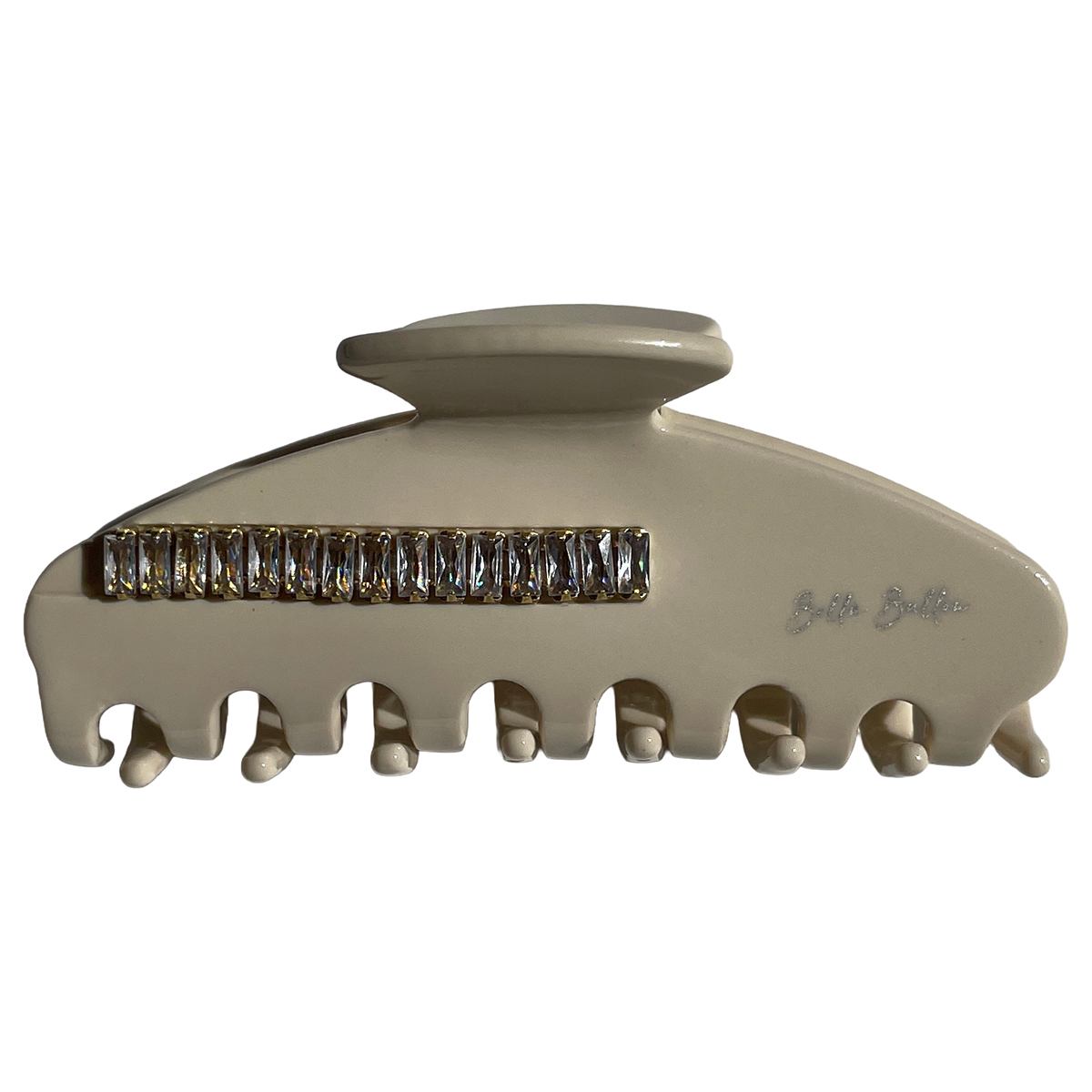 Robust hair clip with a row of rhinestones on both sides and silver-colored logo print. Madein eco-friendly Cellulose Acetate. Fits tight and well in the hair.