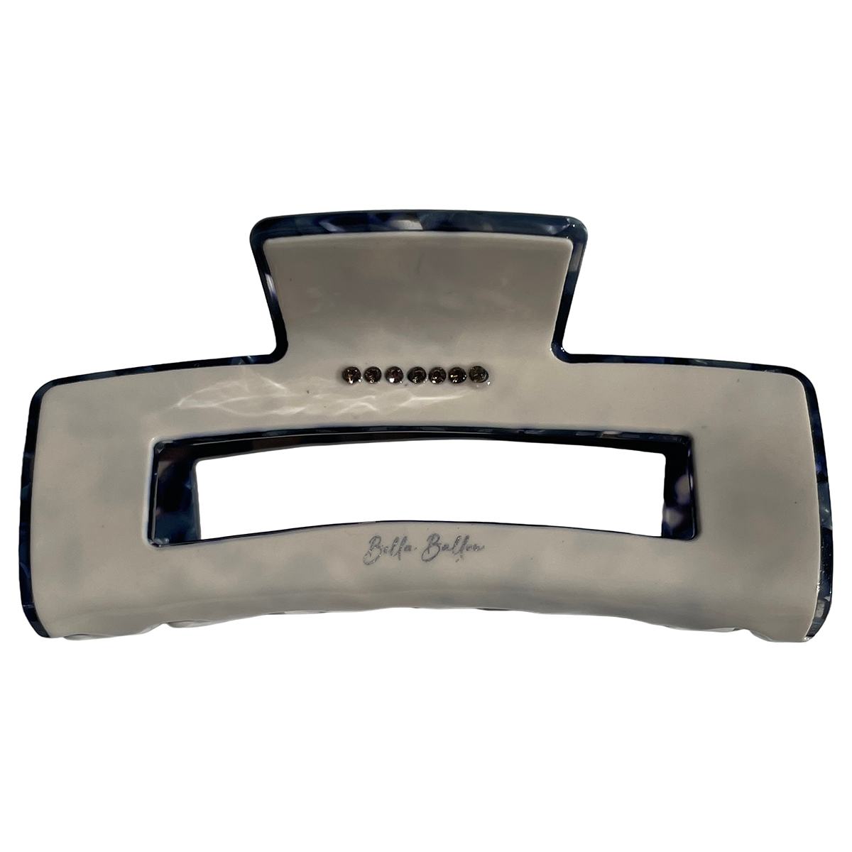 Robust hair clip with a row of rhinestones on both sides and silver-colored logo print. Madein environmentally friendly Cellulose Acetate. Fits tight and well in the hair.