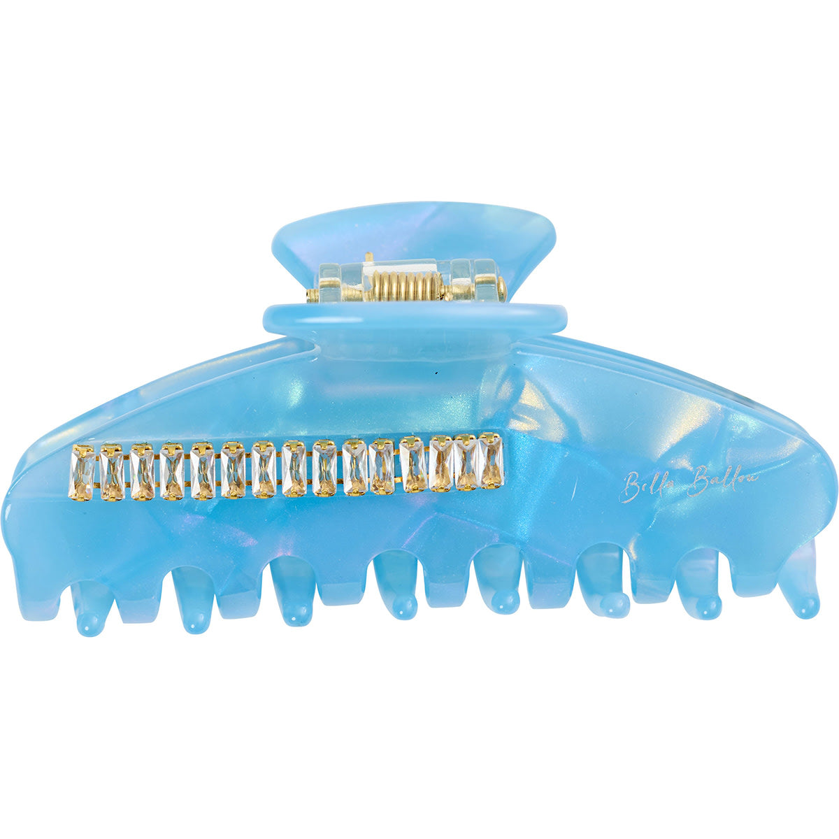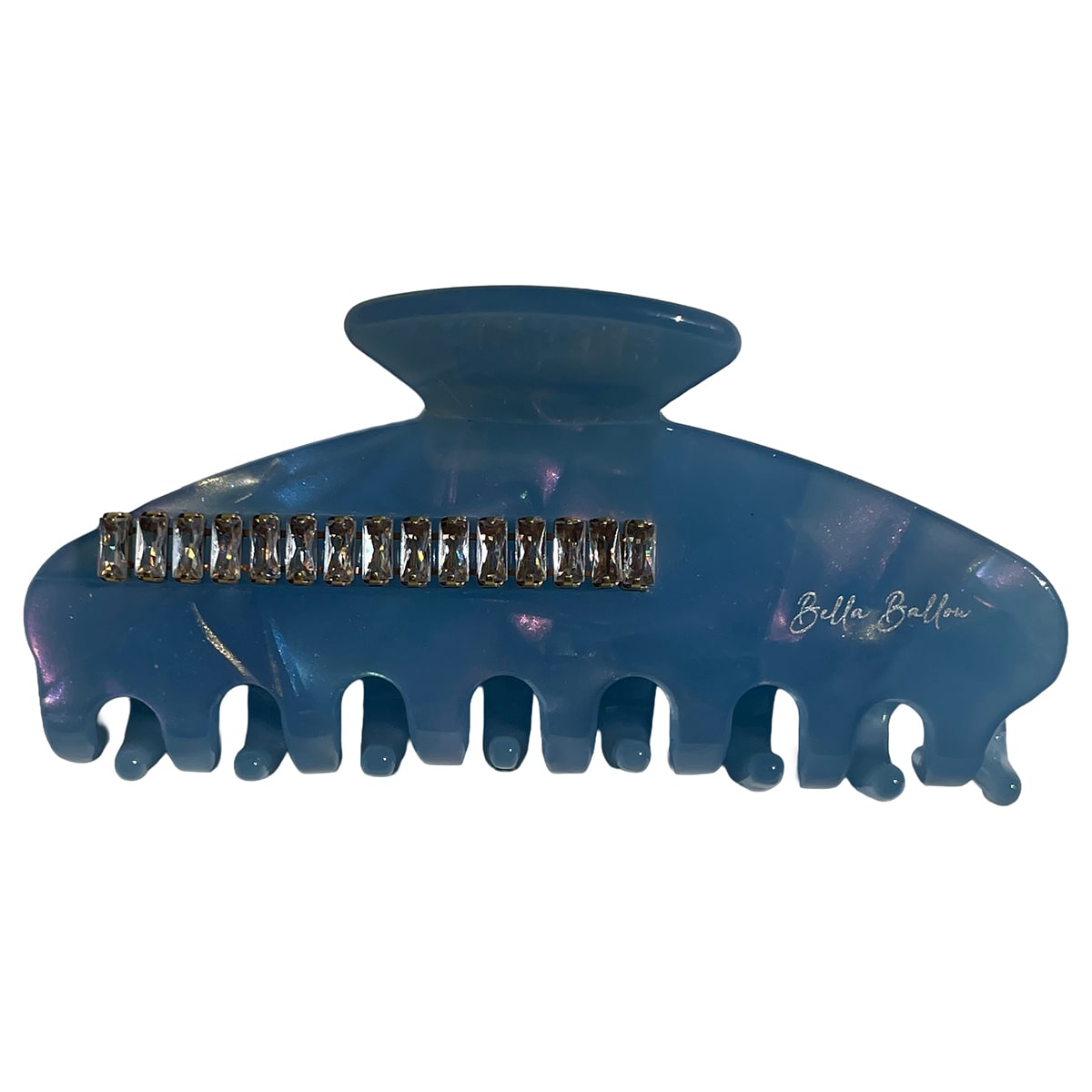 Robust hårklemme med rekke av rhinsten på begge sider og sølvfarget logotrykk. Lageti miljøvennlig Cellulose Acetat. Sitter tett og godt i håret.
