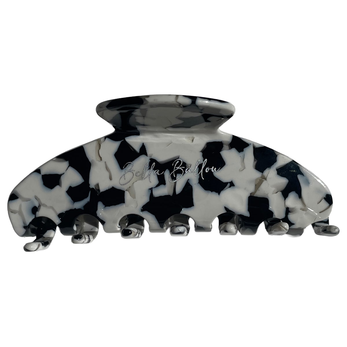 Robust hårklemme med marmor mønster og sølvfarvet logotryk. Lavet i miljøvenligt Cellulose Acetat. Sidder stramt og godt i håret.