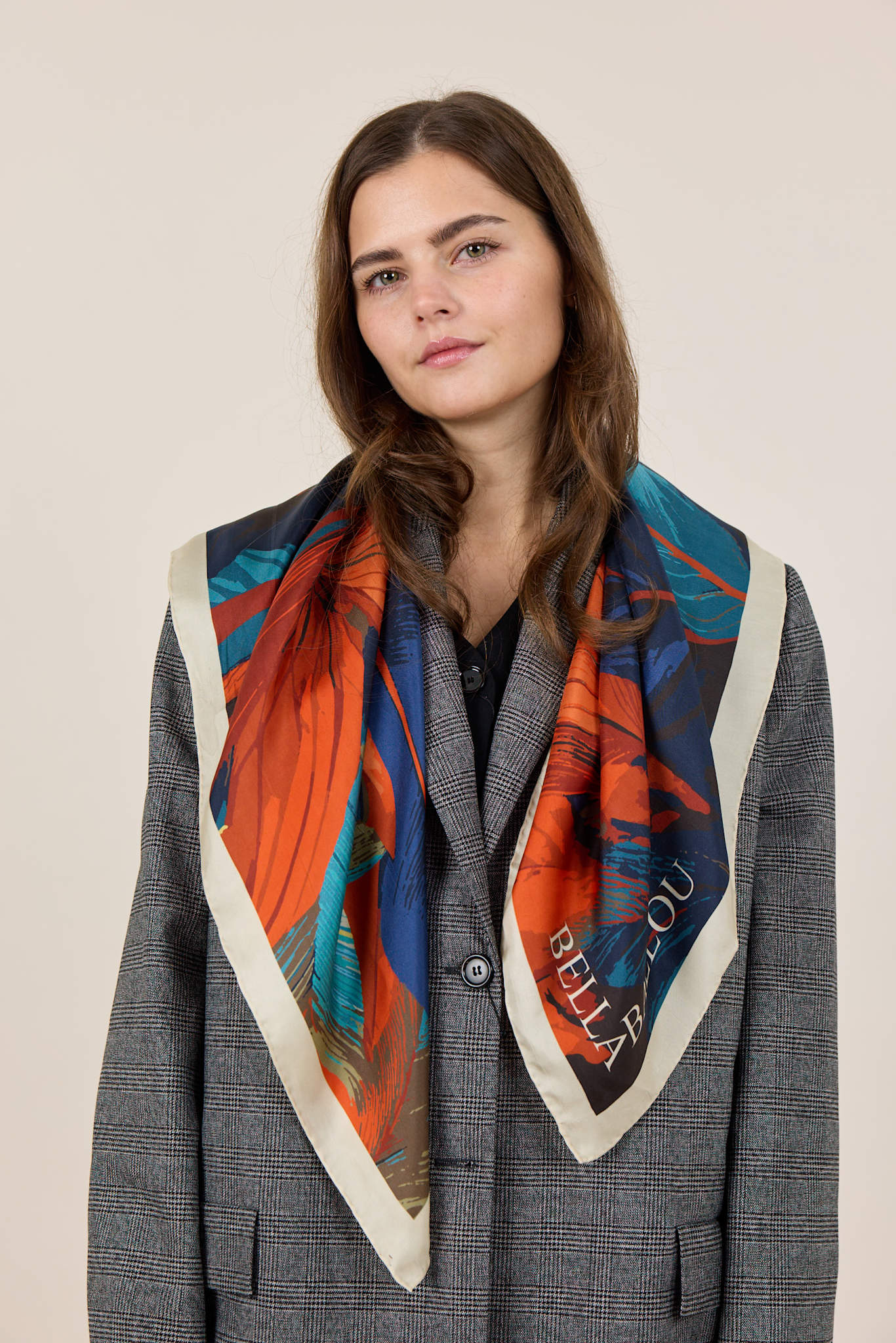 Farverne spænder over varme, gyldne toner og dybe blå nuancer, som fremkalder en sanselig stemning af skov og sæsonskifte. Tørklædet emmer af underspillet luksus og nordisk lethed – tidløst og feminint, med et moderne blik for detaljen.
