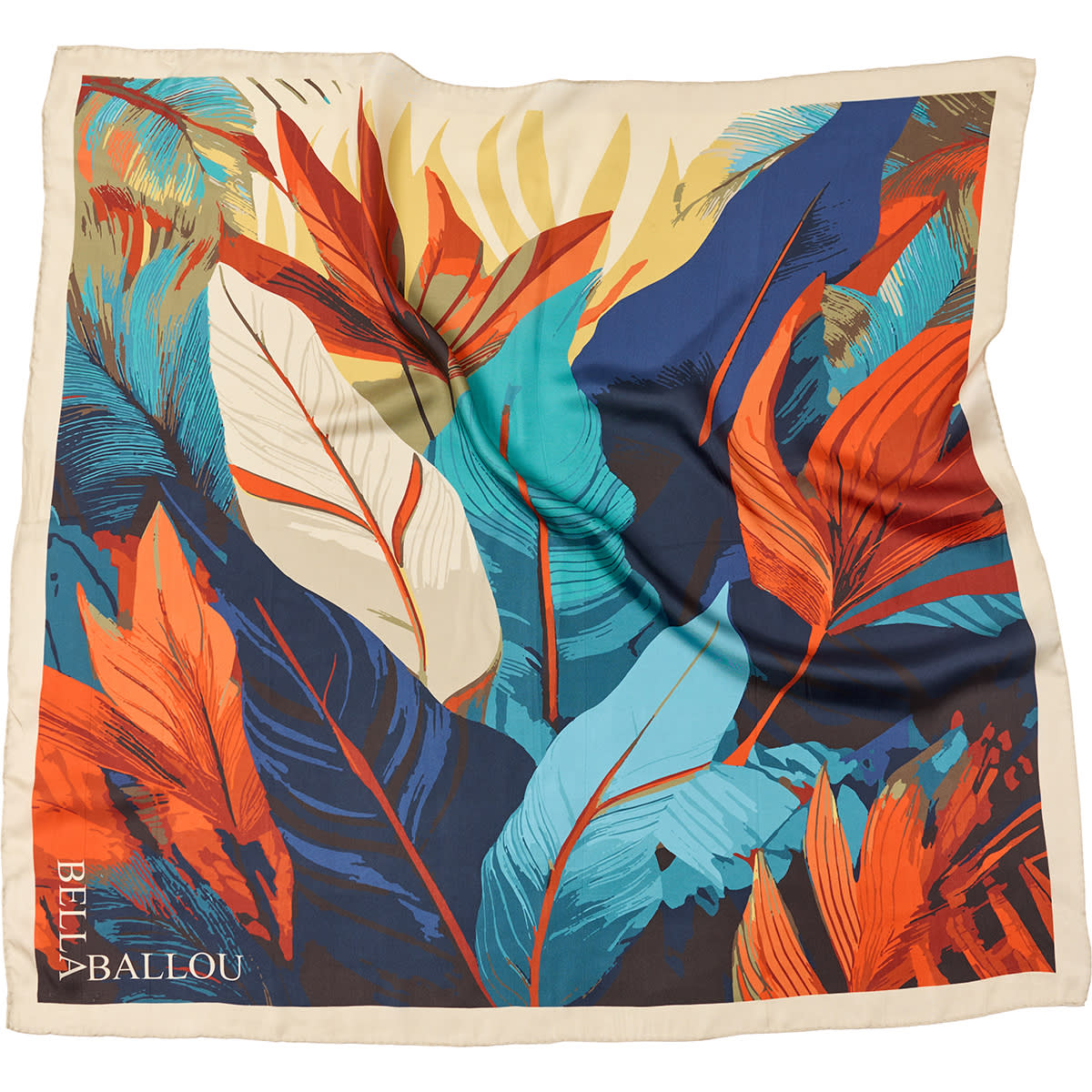 Kvadratisk silketørklæde med print af grafiske blade og håndsyede rullekanter.
