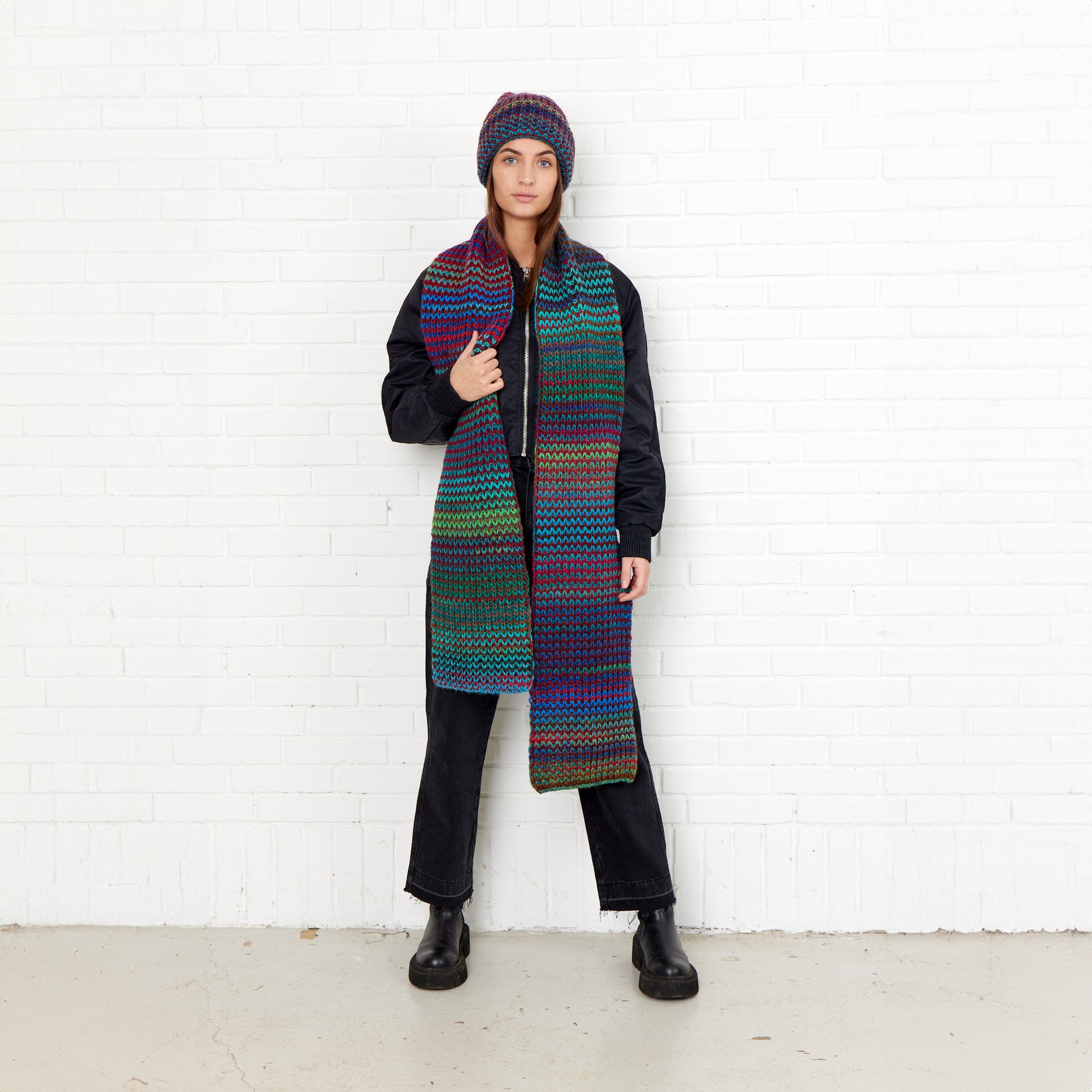 Stort aflangt stribet tørklæde i en kraftig varm "space dyed" uldmix fra Italien.