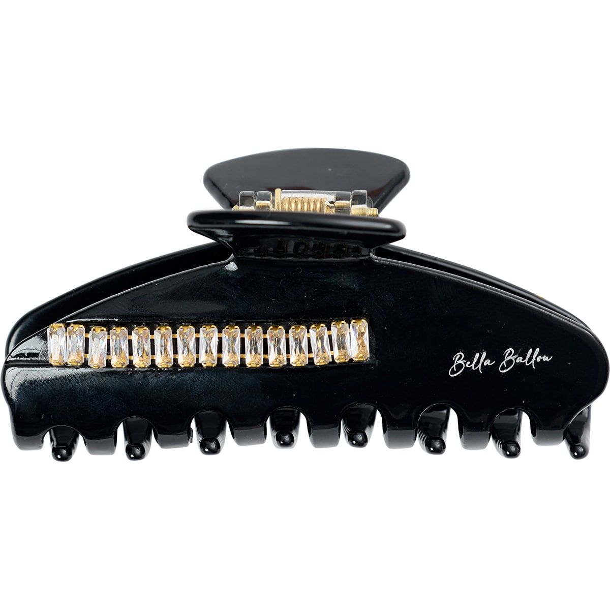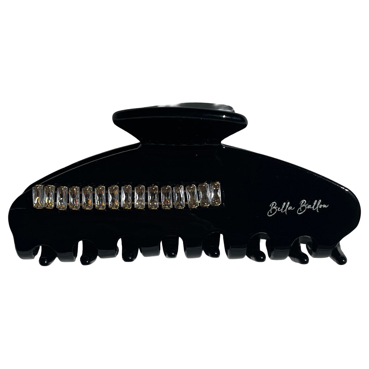Robust hårklämma med rad av rhinsten på båda sidor och silverfärgad logotryck. Tillverkadi miljövänligt Cellulosa Acetat. Sitter tajt och bra i håret.